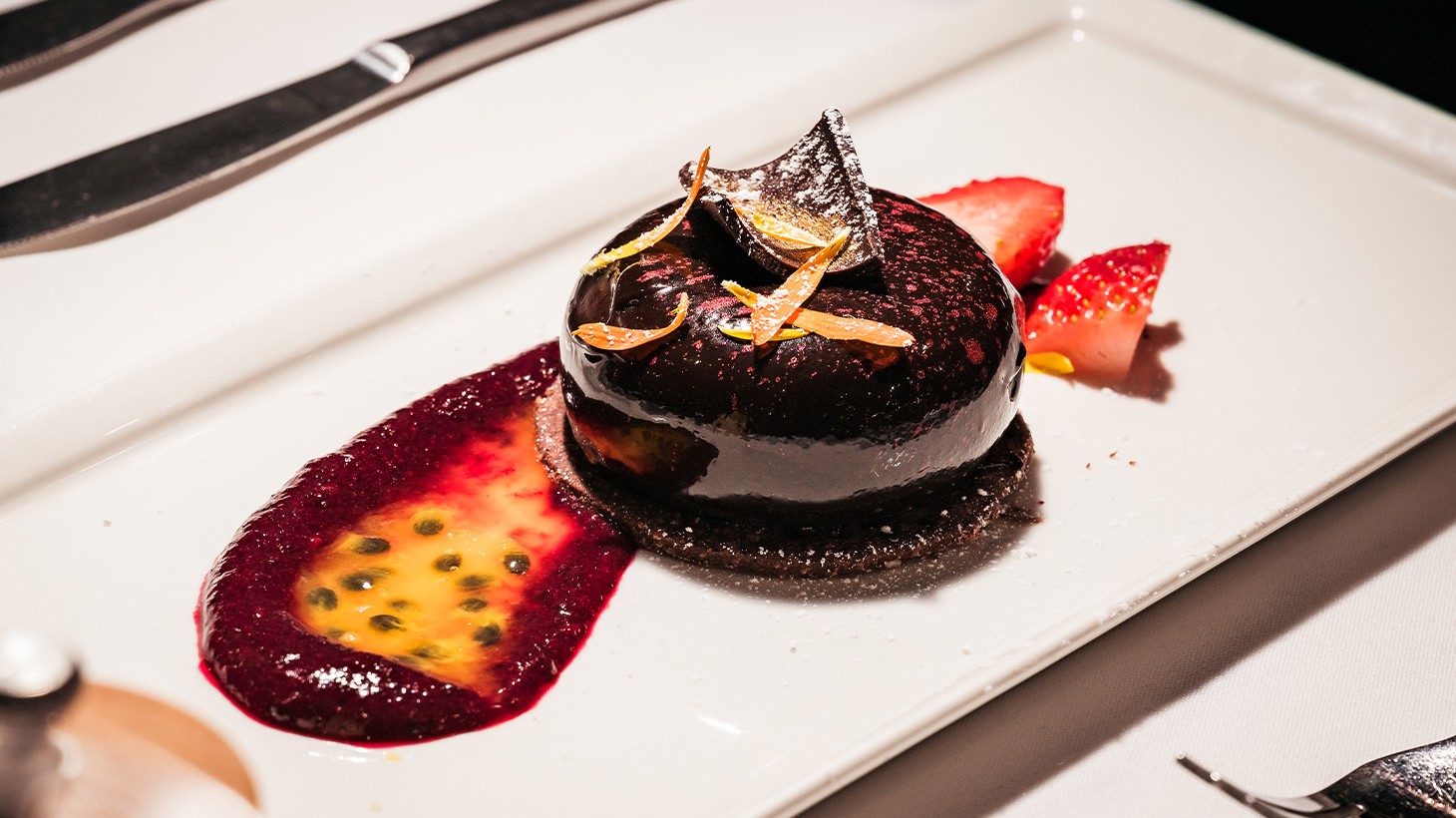 - Tropical cheesecake with tropical compote, chocolate, strawberry