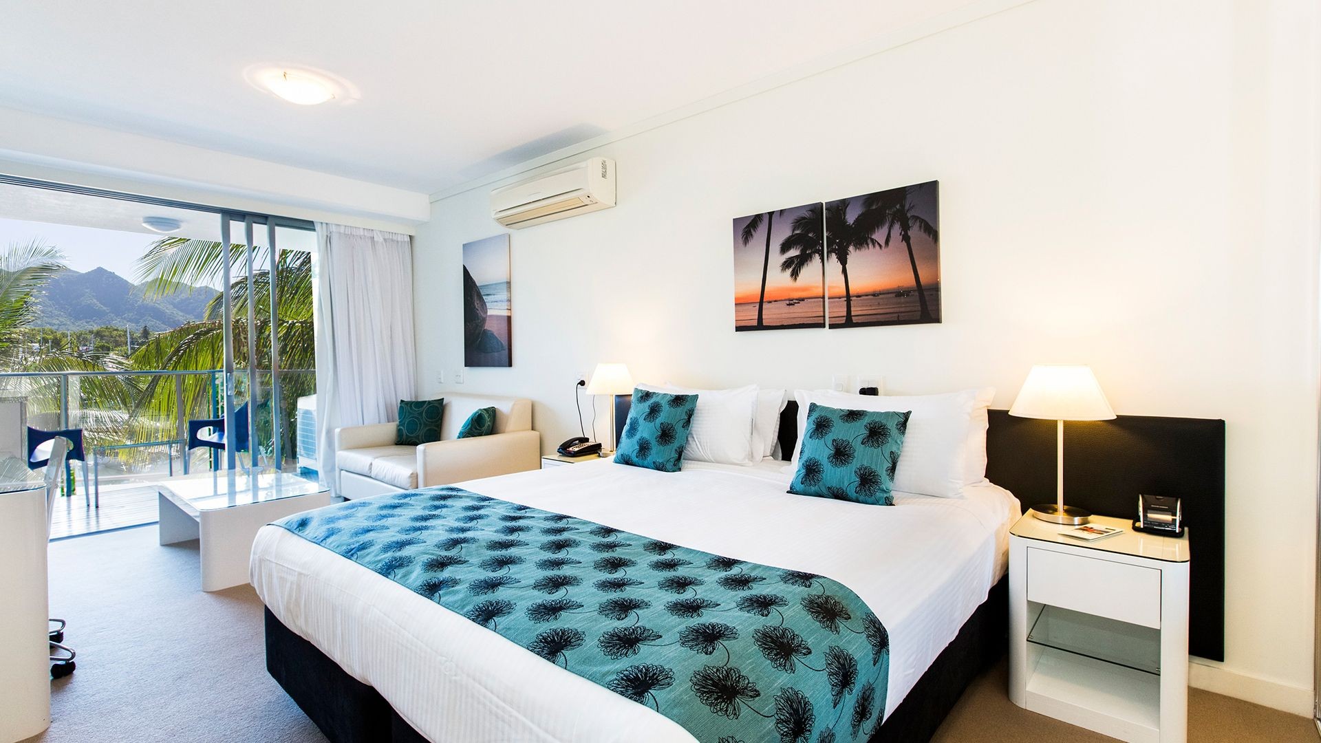 Rest easy in your beautifully furnished, 39sqm Hotel Room featuring a plush king bed, air-conditioned interiors, modern en suite bathroom, a spacious balcony and luxurious extras including cosy bathrobes and complimentary in-room movies.