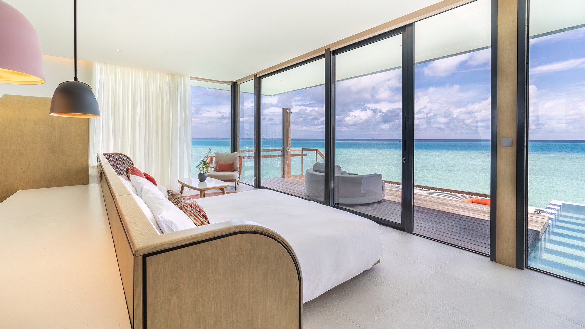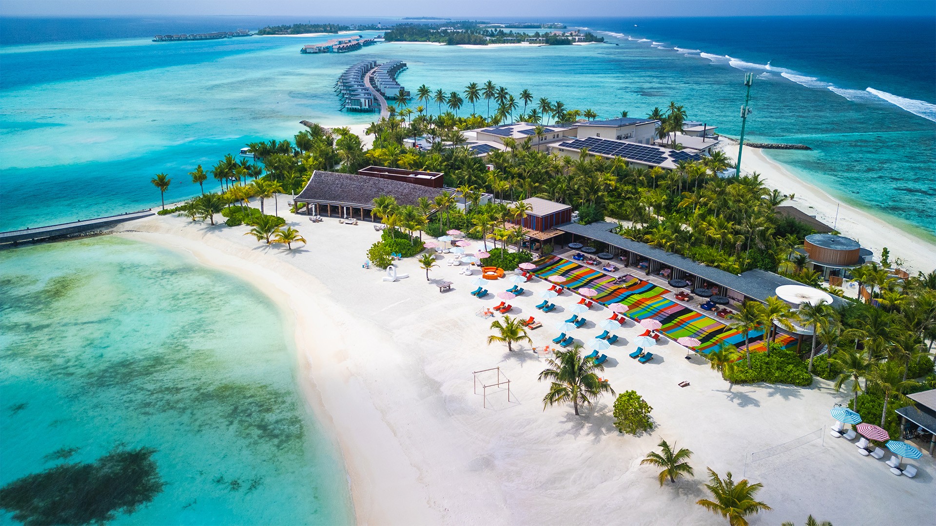 Experience a new level of island glamour at SO/ Maldives, a luxurious escape where castaway meets catwalk among the dazzling azure of the Indian Ocean. Just a quick 15-minute speedboat ride from Malé International Airport lies the resort’s arrival dock — dubbed ‘the runway’ — where guests congregate each evening for cocktails at the Pavilion Bar and the walkway is lit with red neon.