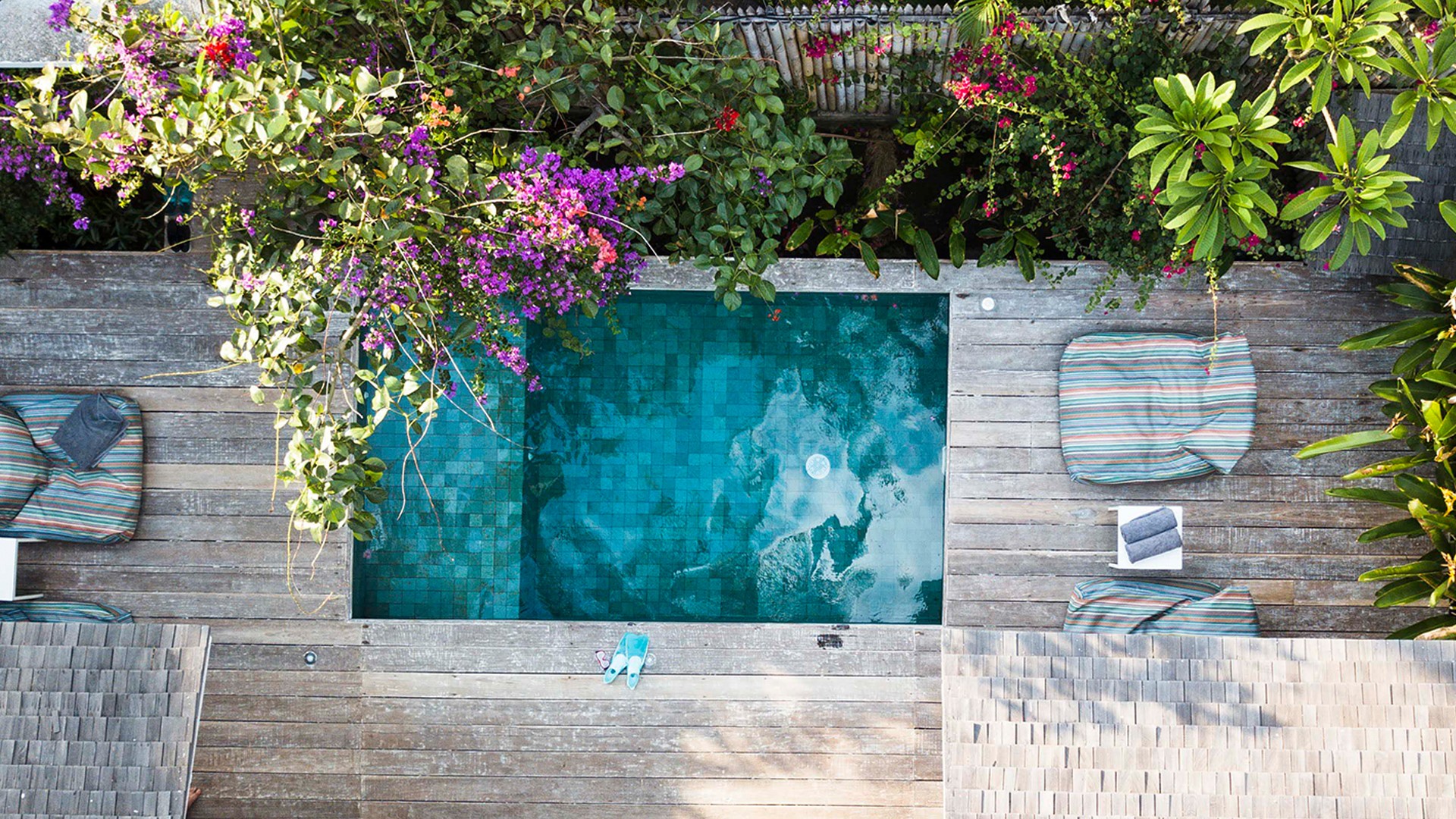 Your outdoor area is a sanctuary of its own: discover a fully-furnished undercover deck with outdoor loungers and beanbag-style sunbeds overlooking your very own private pool, surrounded by lush greenery.